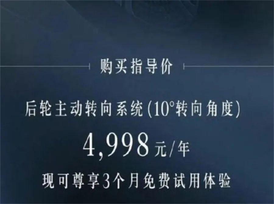 奔驰针对国内EQS开启的提供后轮主动转向系统(10°转向角度)的付费订阅模式中,车主需要缴纳4998元/年的价格进行软件系统的选装,而事实上,后轮转向系统的硬件已经在生产时进行了预埋。