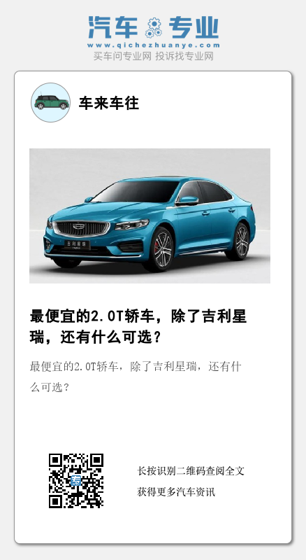 今天看到一个有意思的问题,最便宜的 2.0T 轿车能以多少的价格买到,那么在自主品牌大力发展的当下, 2.0T 车型的价格也是在逐步的下探,之前我们说到过吉利星瑞的 2.0T 可能是目前轿车中最为便宜的 2.0T 了,它的起步价只有 11.37 万元。那么除了吉利星瑞之外,我们还有哪些低价的 2.0T 轿车可以选择。今天我们就来说两款,虽然它们的价格没有吉利星瑞的 2.0T 那么便宜,不过也算是相对较低的。