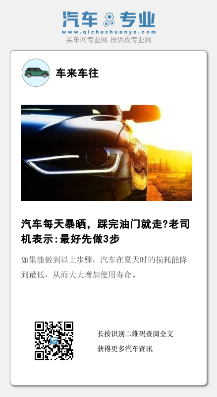 第二是如果有条件,汽车暴晒后在再次开车前最好先让汽车待在阴凉处,使其温度降低下来。在汽车本身的温度较高时,行车对于汽车的负荷也比较重。