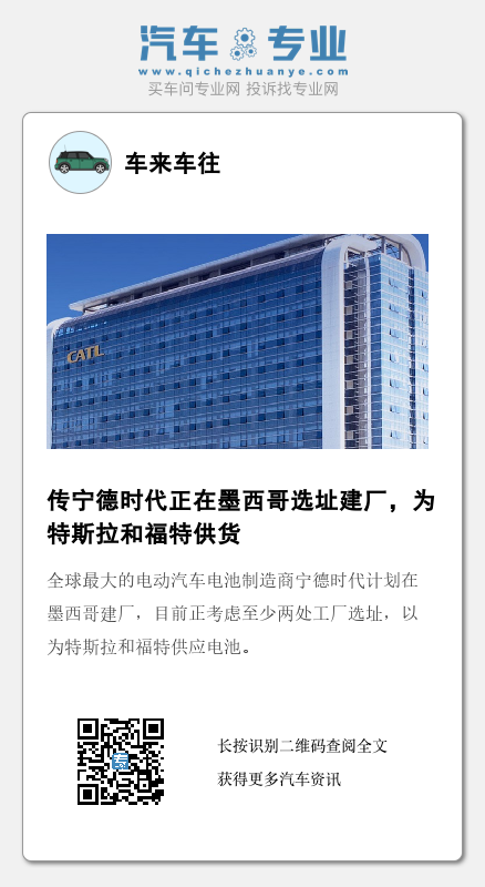据外媒报道,全球最大的电动汽车电池制造商宁德时代计划在墨西哥建厂,目前正考虑至少两处工厂选址,以为特斯拉和福特供应电池。