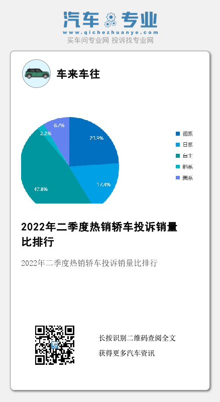 据国内领先的缺陷汽车产品信息收集平台车质网数据显示,2022年二季度共受理国内轿车投诉量累计为14,266宗,乘联会数据显示同期国内轿车(除进口车)销量约为229.2万辆。除进口车型外,二季度有销量数据支撑的轿车共有195款,为确保数据的准确性,车质网本次只统计这195款车型的首次投诉案例,计算得出2022年二季度轿车投诉销量比均值为万分之41.6,数值较一季度的万分之32.9出现明显提升,整体投诉销量比表现出现转差迹象。