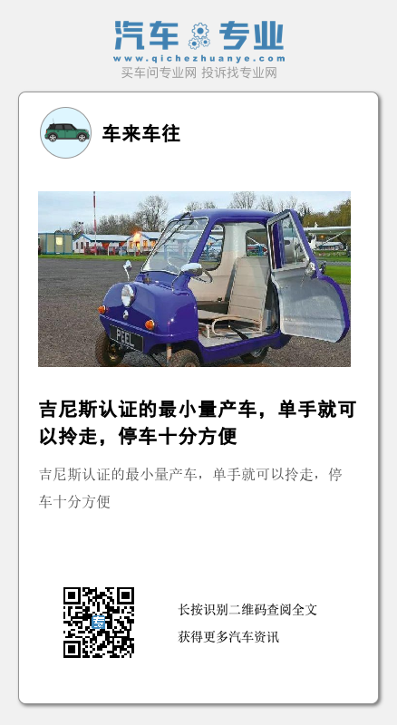 吉尼斯认证世界上最小的量产车peel p50,这辆车到底有多小呢?这样说吧,奇瑞QQ3在它面前是大哥大,这样说一点都不过分,让我们来对比一下。奇瑞QQ:长3.55米,宽1.495米,高1.485米,轴距2.34米。peel p50:长1.34米,宽0.98米,高1米,轴距1.27米,这车要是停在奇瑞QQ面前要仰视。