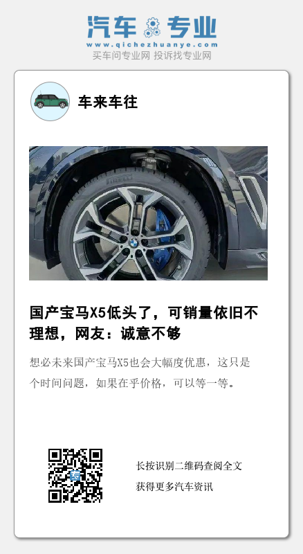 其实消费者对于国产宝马X5有一个期待价格,如果在接受范围内,宝马X5的总销量应该达到万辆以上才算正常,如果销量不能翻倍,就失去了国产的意义了。