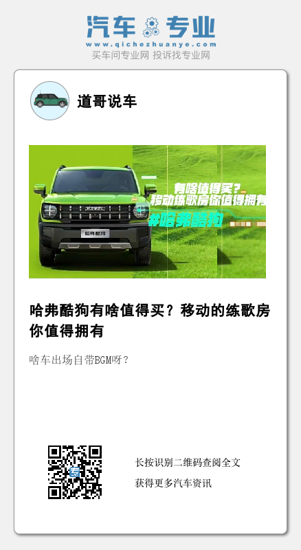 啥车出场自带BGM呀?(哈喽,酷狗~)今天我们就来聊聊哈弗酷狗。它最大的卖点就是车内标配18个扬声器,官方定位潮酷音乐座驾,与此同时酷狗的这套音乐系统还包含了座椅律动功能、以及64色律动氛围灯以及香氛系统,多系统智能组合联动带来的是听觉、触觉、视觉、嗅觉的全方位体验,听音乐也可以感受到4D氛围,并且除了听歌,你也可以通过车机系统中的雷石KTV系统把酷狗这辆车变成移动的KTV,出去玩的路上不会无聊了。