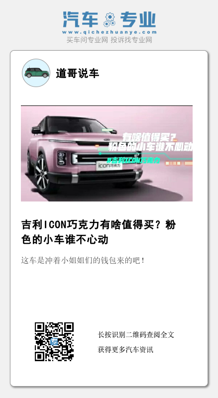巧克力也能开上路了!今天咱们就聊聊吉利ICON巧克力。这款车在造型上就标新立异了,摆脱家庭面具,其前格栅采用内凹的“弓字型”元素,整体分上、中、下三部分,在加强视觉层次感的同时,也让车辆更具辨识度。同时,新车上方的日行灯横向嵌入在前发动机舱盖上,十分动感。内饰方面,吉利ICON巧克力提供“纯真白巧”和“咖啡生巧”内饰配色方案,满足不同消费者的审美需求。具体来看,新车采用了三辐式多功能抗菌涂层方向盘,搭配由12.3英寸中控屏+10.25英寸全液晶仪表组成的720mm悬浮式双联屏,搭配72色呼吸氛围灯,让车辆的科技感直接拉满。同时,该车还将提供1.7㎡全景天幕。而且看这个车身的颜色粉蓝配色,再加上这甜蜜的名称,这车也是冲着小姐姐们的钱包来的吧!