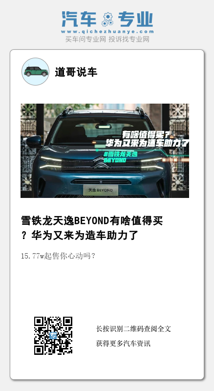 华为又来帮着研发车机啦!今天我们就来聊聊东风雪铁龙天逸BEYOND。为了更好地满足客户的智能需求,东风雪铁龙开始壮大自己的“朋友圈”了,携手华为、联通两大行业巨头,共同研发了响应速度更快、操控更流畅、功能更丰富的交互式智能网联系统。这个系统不仅配备了支持上千种语言的AI虚拟人智能语音交互,能秒懂你所需,让你做真君子,能动口绝不动手。同时,丰富多彩的沉浸式车载娱乐中心、AR实景导航、OTA云端升级、360°全景泊车影像+透明底盘等一系列功能,让出行体验充满智慧,更加轻松。15.77w起售你心动吗?