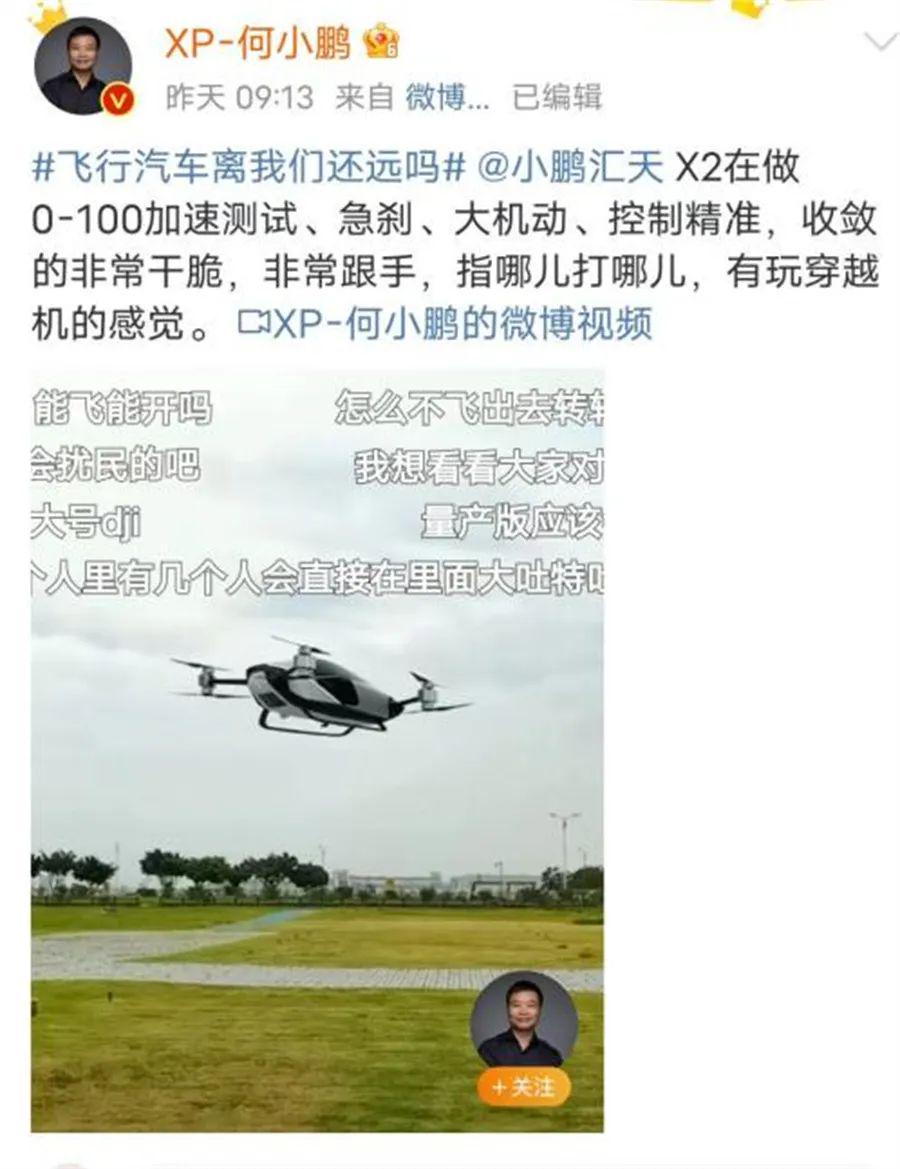 创始人何小鹏经常在社交平台上与网友们分享小鹏飞行汽车的最新动态。日前,他在其个人账号上传了飞行汽车X2的“0-100加速、以及急刹、大机动”的测试视频,何小鹏表示控制精准,收敛的非常干脆,非常跟手,指哪儿打哪儿,有玩穿越机的感觉。