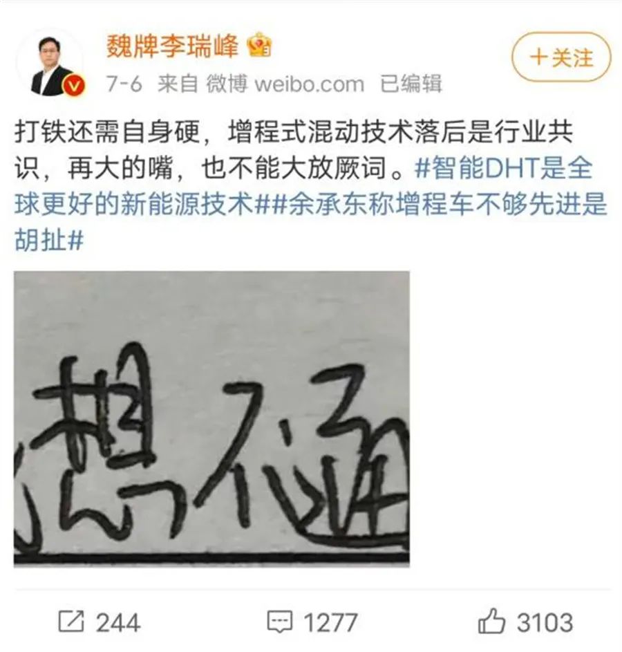 《汽车专业网》编辑注意到,这已经不是李瑞峰第一次公开发文称增程式混动技术落后了。此前,李瑞峰隔空喊话华为余承东,引发了增程式混动落后还是高级之争,并在其微博账号公开表示:“打铁还需自身硬,增程式混动技术落后是行业公认,再大的嘴,也不能大放阙词。”