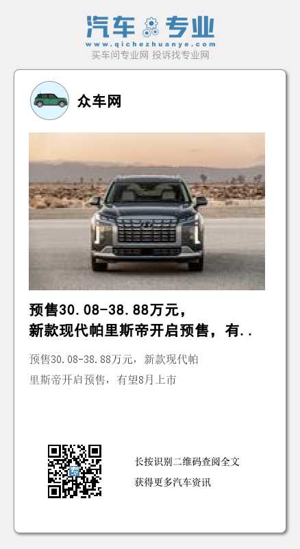 7月20日,新款现代帕里斯帝(图片|配置|询价)正式开启预售,新车推出了4款配置车型,首次引入了Calligraphy(鉴赏家)4WD版本,预售价区间为30.08-38.88万元。作为中期改款车型,新车的外观内饰均有着较大的升级,预计将会在8月份正式上市。