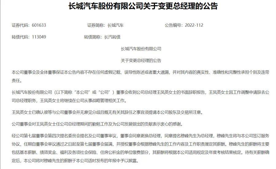 7月24日,长城汽车公告称,公司董事会收到公司总经理王凤英的书面辞职报告,王凤英因工作调整申请辞去公司总经理职务。另据公告,董事会同意更换总经理,同意提名穆峰为总经理。