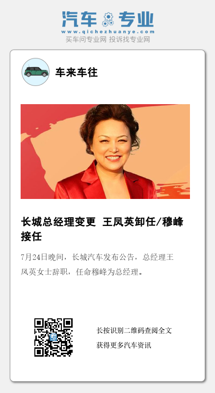 7月24日晚间,长城汽车发布公告,总经理王凤英女士辞职,任命穆峰为总经理。据介绍,王凤英女士因工作调整申请辞去公司总经理职务,继续从事战略管理相关工作。公司董事会对王凤英女士任公司总经理期间的勤勉工作及为公司发展做出的贡献表示感谢。