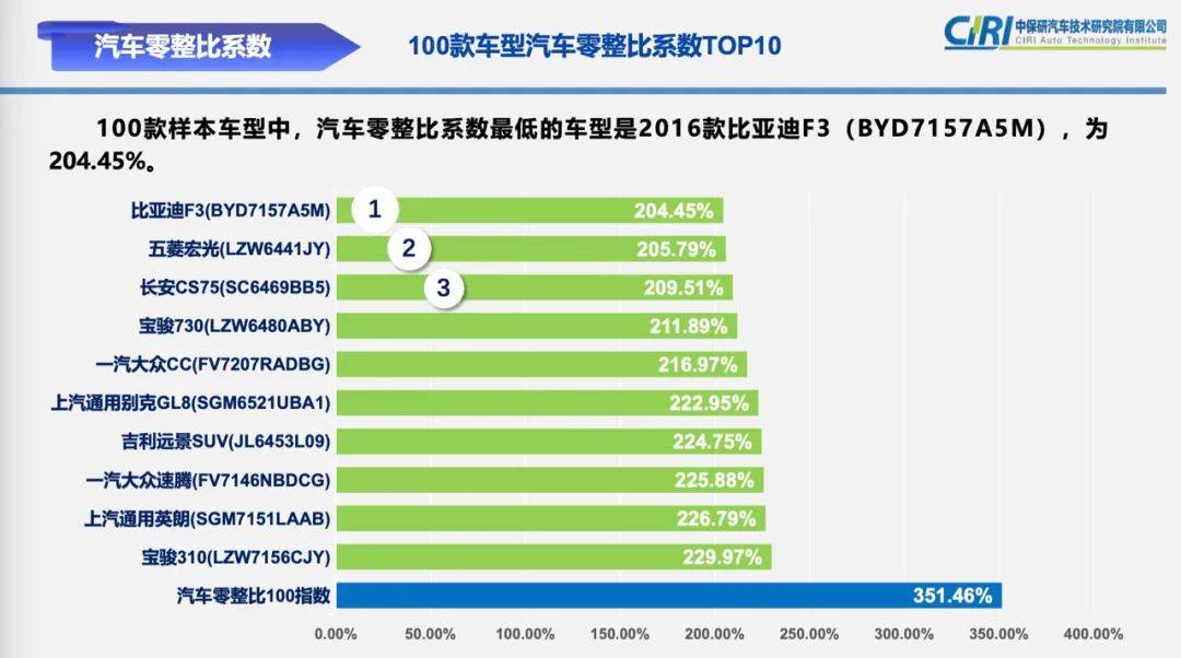 根据中保研汽车技术研究院(以下简称“中保研”)12月27日发布的第13期汽车零整比数据,在100款样本车型中,汽车零整比系数最低的车型是2016款比亚迪F3(BYD7157A5M),为204.45%。