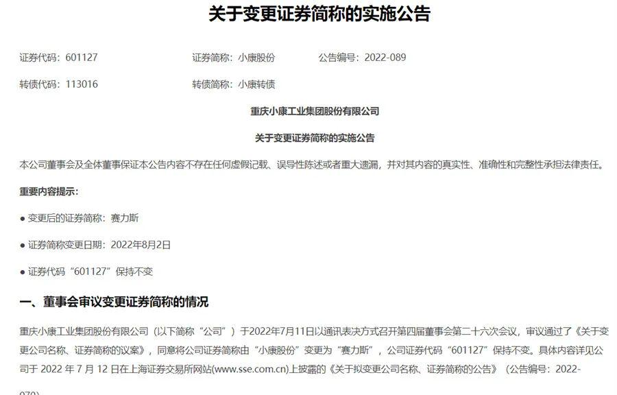 【文/道哥说车 听风吟】7月27日,小康股份发布公告称,经公司申请,并经上海证券交易所办理,公司证券简称将于2022年8月2日由“小康股份”变更为“赛力斯”,公司证券代码“601127”保持不变。