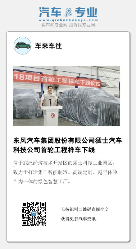 7月28日,东风汽车集团股份有限公司猛士汽车科技公司首轮工程样车在东风技术中心试制车间下线,标志着其迈入发展快车道。