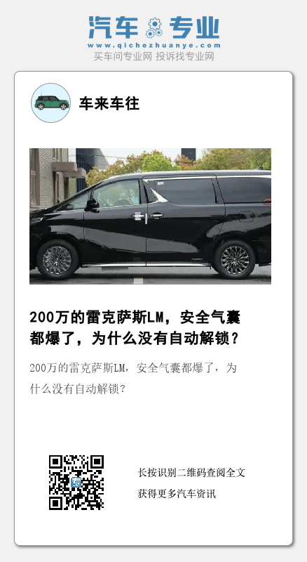 近日,一辆雷克萨斯LM在行驶中发生了车祸,当救援人员想第一时间打开车门的时候,结果从外面无法打开,紧急时刻只能撬车门破车窗,后来有一个人没救出来。200万的雷克萨斯LM,安全气囊都爆了,为什么车门没有自动解锁?这起事故引发了很多人关于安全的思考。