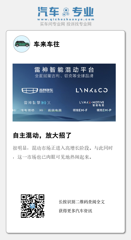吉利只是混动技术不断精进的自主车企之一。结合比亚迪、长城等车企的技术进展来看,在动力性、油耗等方面,自主车企混动技术已日益成熟。