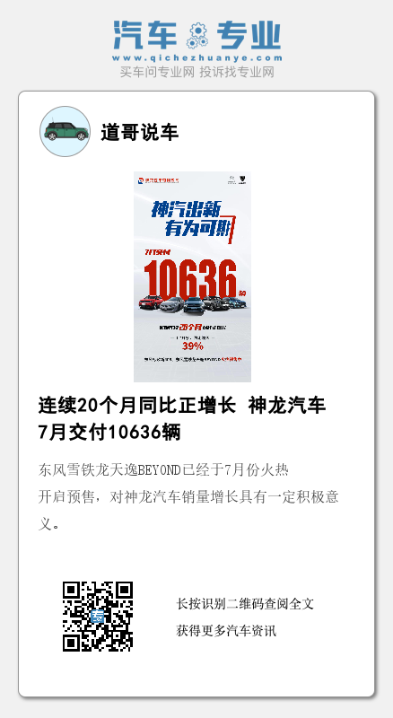 《道哥说车》从神龙汽车官方获悉,今年7月份神龙汽车交付10636辆,实现连续20个月的同比正增长;1-7月累计销量66395辆,累计同比增长39%。