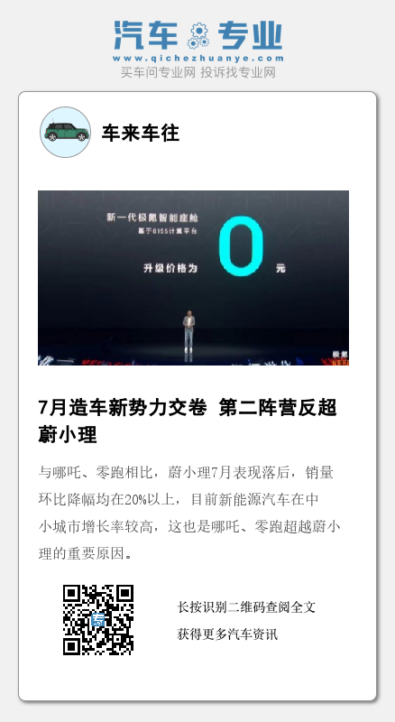 值得关注的是,哪吒汽车7月位列造车新势力新车交付榜第一名。其实早在6月,哪吒汽车的销量就已经反超蔚来和理想汽车,仅次于小鹏汽车,排在造车新势力第二名,而7月一举越过蔚小理,取得了冠军位置。