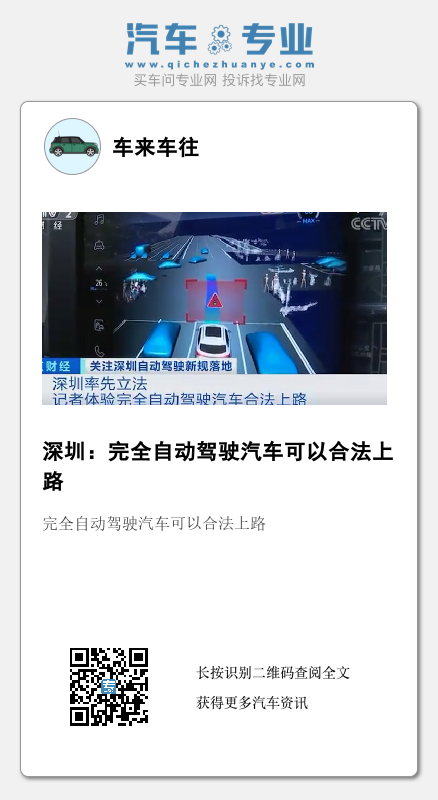 8月1日起生效的《深圳经济特区智能网联汽车管理条例》规定,智能网联汽车经公安机关交通管理部门登记,可以上道路行驶;经交通运输部门许可,可以从事道路运输经营活动。条例中的这个“智能网联汽车”,包括有条件自动驾驶、高度自动驾驶和完全自动驾驶三种类型。