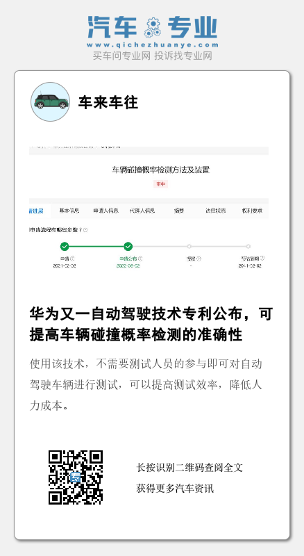 此前,5月3日,华为技术有限公司公布“自动驾驶车辆的测试方法、装置及系统”专利。使用该技术,不需要测试人员的参与即可对自动驾驶车辆进行测试,可以提高测试效率,降低人力成本。
