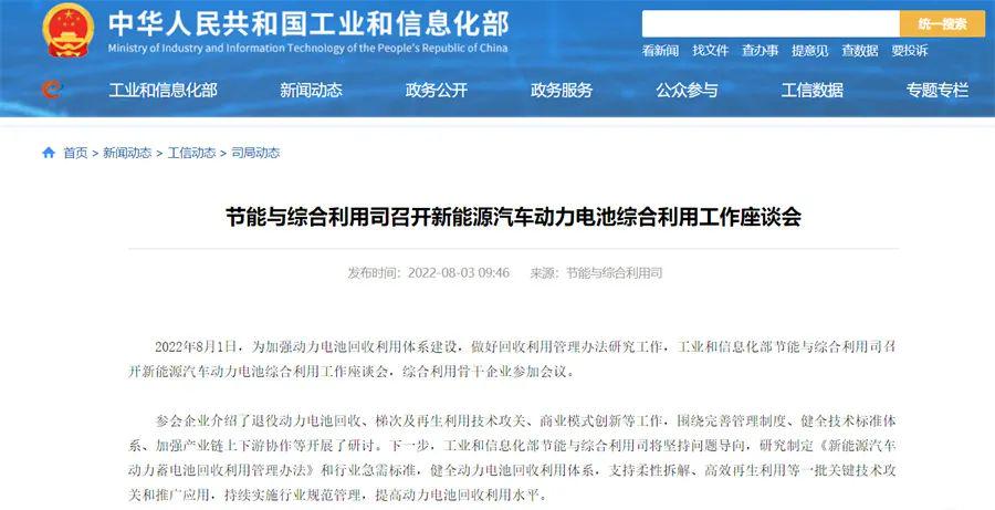 工信部网站消息称,8月1日,为加强动力电池回收利用体系建设,做好回收利用管理办法研究工作,工业和信息化部节能与综合利用司召开新能源汽车动力电池综合利用工作座谈会。而下一步则是,研究制定《新能源汽车动力蓄电池回收利用管理办法》和行业急需标准。