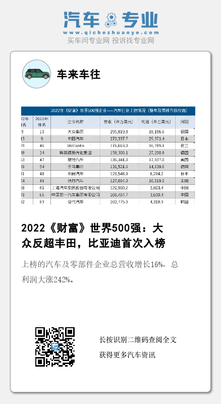 依据2022《财富》世界500强榜单,盖世汽车整理出汽车行业入榜情况。