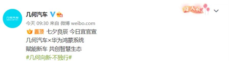 【文/道哥说车 听风吟】8月4日七夕节,吉利旗下几何汽车在官微宣布“牵手”华为鸿蒙系统,并配文“赋能新车,探索未来”,从海报来看,搭载HarmonyOS系统新车或将在不久后上线,至于是全新车型还是老车型的换代、改款车型尚未可知。事实上,智能化算是吉利系品牌的一个短板,几何品牌在智能化的表现方面也并不算优秀,与华为的合作或许能够提升其智能化的水平,而就几何品牌自身而言也确实需要一些改变来让自身站的更高。