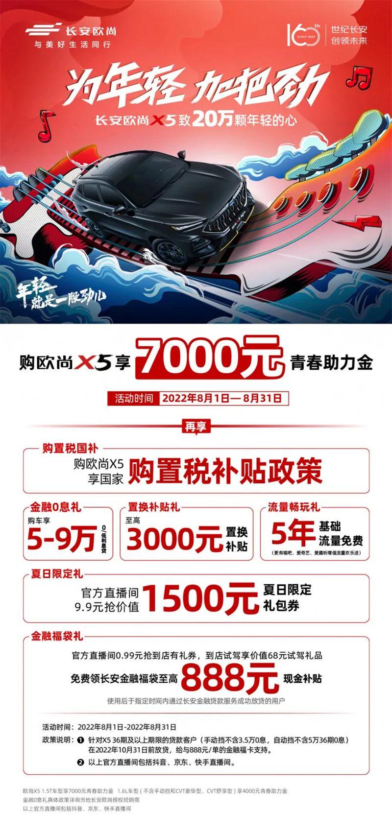8月1日-8月31日期间,购欧尚X5将享七重豪礼,包括享7000元青春助力金、国家购置税补贴政策、5-9万零/低利息贷、至高3000元置换补贴、5年基础流量免费,以及进入欧尚官方直播间即可“9.9元抢价值1500元夏日限定礼包券”,还有“0.99元抢到店有礼券,到店试驾享价值68元试驾礼品,免费领长安金融福袋至高888元现金补贴”。让你在炎炎夏日享受到真正的冰点价,把购车福利统统带回家!