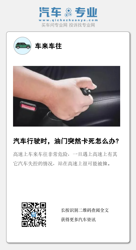 亦或者司机大脑一片空白,双手完全放开了方向盘,那可能造成的后果会更加严重。所以在油门卡死后,我们应该保持清醒的头脑,先把方向盘掌握住,让汽车继续开下去。