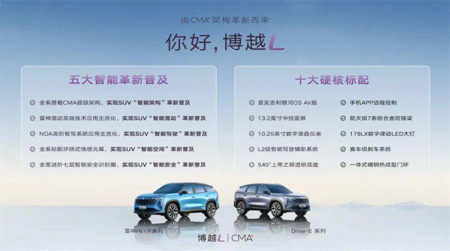 作为同时得到“智能吉利2025”科技成果和“全面架构造车”赋能的旗舰级战略产品,博越L传承了CMA架构的“安全、健康、智能、性能、节能”五大全球基因与雷神混动系统。
