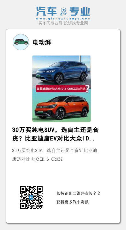 回到购车的角度,如果您对动力有着很高的要求、喜欢优雅大气的外观并且能接受较长时间的等待,那么比亚迪唐EV是一个不错的选择。如果您着急用车、喜欢更加时尚的外观并且没有太高的动力要求,那么笔者建议您选择大众ID.6 CROZZ。现在问题来了,给你30万元左右的预算,你会选择比亚迪唐EV还是大众ID.6 CROZZ?欢迎给我们留言。
