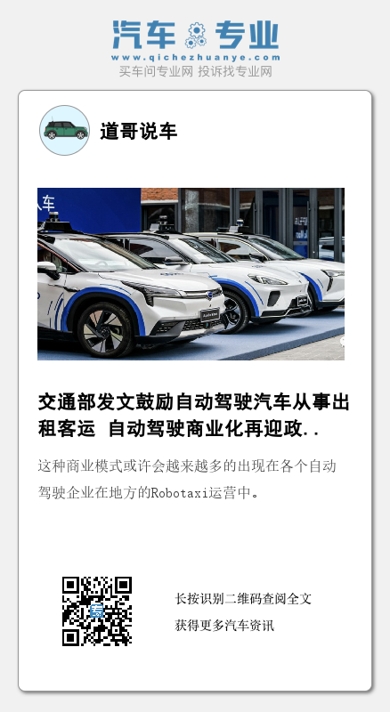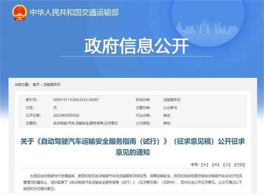 【文/道哥说车 听风吟】8月8日,交通运输部就《自动驾驶汽车运输安全服务指南(试行)》(征求意见稿)公开征求意见。《指南》指出,在保障运输安全的前提下,鼓励在条件相对可控的场景使用自动驾驶汽车从事出租汽车客运经营活动。