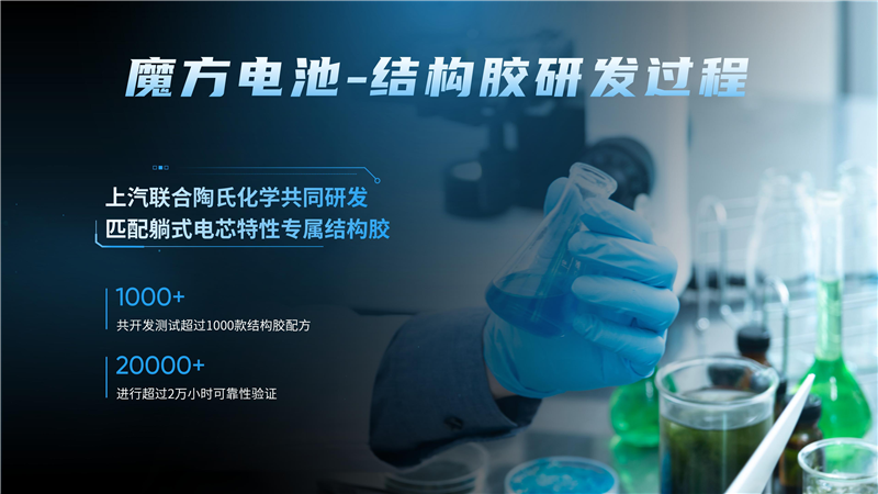 目前业界对电芯的处理方式都是立式摆放,将电芯“躺式”放置为结构设计开发带来了巨大的难题。因为结构胶会随着电芯膨胀以及压板相应变形,面临苛刻的受力工况,同时需要匹配电芯超长生命周期,这对结构胶性能提出了巨大的挑战。在魔方电池整个开发过程,上汽创新研发总院的工程师联合合作伙伴共同开发测试了千余款结构胶方案,历经两万小时的可靠性验证,最终才确定结构胶配方。