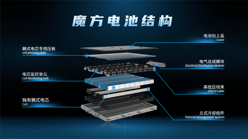 独有的躺式排布电芯设计能够降低电芯之间有效接触面积,减小热传递通道;气凝胶阻燃材料可以有效实现物理热量隔离,确保单个电芯热失控后不影响周边相邻电芯,降低自燃伤害。此外,魔方电池还加装了自动泄压防爆阀,通过主动泄压,释放电池包内压力,使过热气体降温,防止气体喷射。