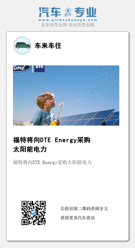 据外媒报道,福特已承诺每年从DTE Energy公司购买至少价值1.2亿美元的太阳能电力,后者计划将其位于密歇根的太阳能基础设施扩大近70%,达到650兆瓦。