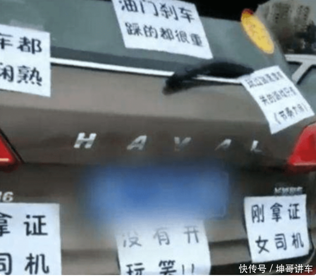 图片放大之后可以发现,每张纸上基本都有不同的内容,而这些内容基本上都是在自嘲。将这些纸上的内容连起来,那就是:我是一位女司机,刚拿下驾照,开车还不太熟练,完全没有操控的,油门刹车踩得都比较重。