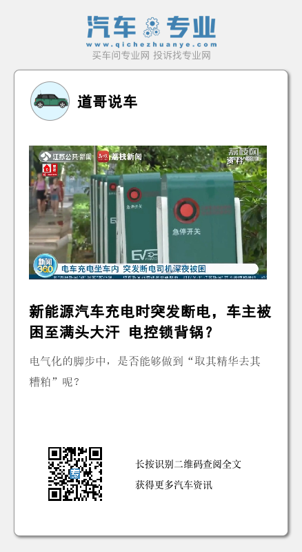 但并不是所有的事故都要追责与“新能源汽车”这一名词,毕竟断电的可能性有很多,即便是燃油车出现“断电”故障也并不足为奇。而就上述车辆断电,车门落锁打不开一事而言也是如此,售后行业人士对《道哥说车》编辑表示,燃油车用电控锁也比较普遍,一般来说,机械锁或者电控锁并不挑车型,只是看厂家怎么做,当然新能源汽车中几乎全是。