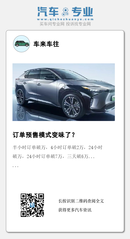 但是,近两年预售订单模式的走向似乎变味了,有的开始以鼓吹订单量为噱头。网上关于产品订单预售量破万的消息层出不穷,比如半小时订单就破万,24小时盲订破万、3天订单破3万台等产品似乎多的是。目前,罕有称自己发布的新产品订单量仅在千辆左右的品牌了。