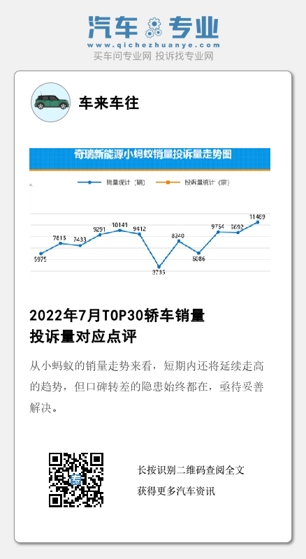 7月,奇瑞新能源小蚂蚁迎来的高光时刻,月销量再次突破万辆,并创造了车型月销量历史最高纪录。不过,同样创造纪录的还有投诉量。作为奇瑞新能源的主销车型,小蚂蚁在进入2022年后的市场表现起伏不定,但总体还是保持着向上的趋势。但需要注意的是,小蚂蚁的月投诉量在6月份触底后,又迎来大幅反弹,再次出现了口碑转差的迹象。据车质网数据显示,小蚂蚁的投诉故障问题覆盖面较大,但其中“动力电池故障”和“充电故障”投诉最为集中,已成为该车型的“通病”。从小蚂蚁的销量走势来看,短期内还将延续走高的趋势,但口碑转差的隐患始终都在,亟待妥善解决。