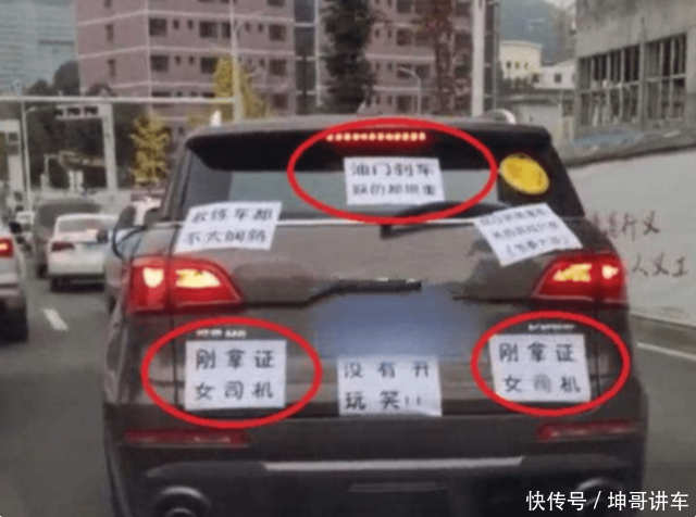 图片放大之后可以发现,每张纸上基本都有不同的内容,而这些内容基本上都是在自嘲。将这些纸上的内容连起来,那就是:我是一位女司机,刚拿下驾照,开车还不太熟练,完全没有操控的,油门刹车踩得都比较重。