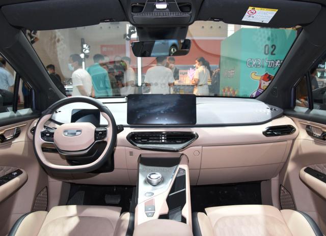 在车内设计上,几何C与上一代相比基本没有变化,前排整体还是以双层中控台、悬浮式仪表盘+中控屏、多边形空调出风口组成,造型简约而有时尚气息。双幅式方向盘以及中央扶手区控制面板,让车内增加了极强的科技感,尤其是换挡旋钮前方的触控面板,让我们操作时犹如控制一台未来飞行器。
