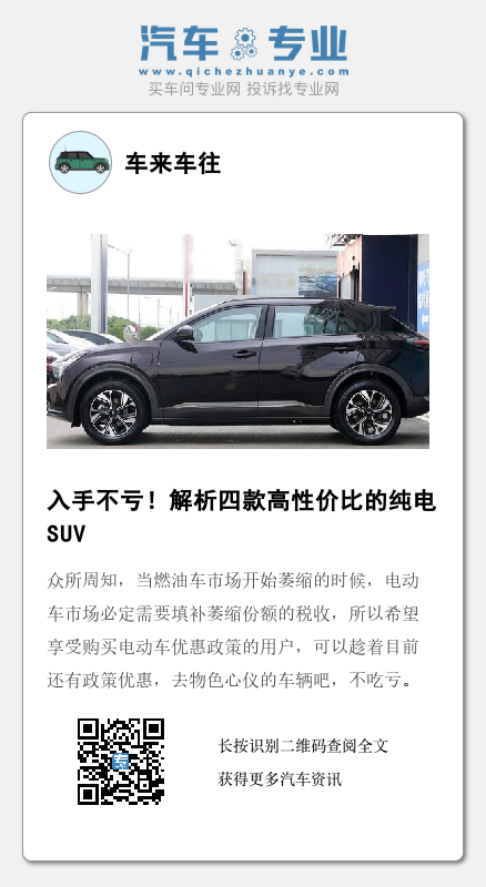 众所周知,当燃油车市场开始萎缩的时候,电动车市场必定需要填补萎缩份额的税收,所以希望享受购买电动车优惠政策的用户,可以趁着目前还有政策优惠,去物色心仪的车辆吧,不吃亏。