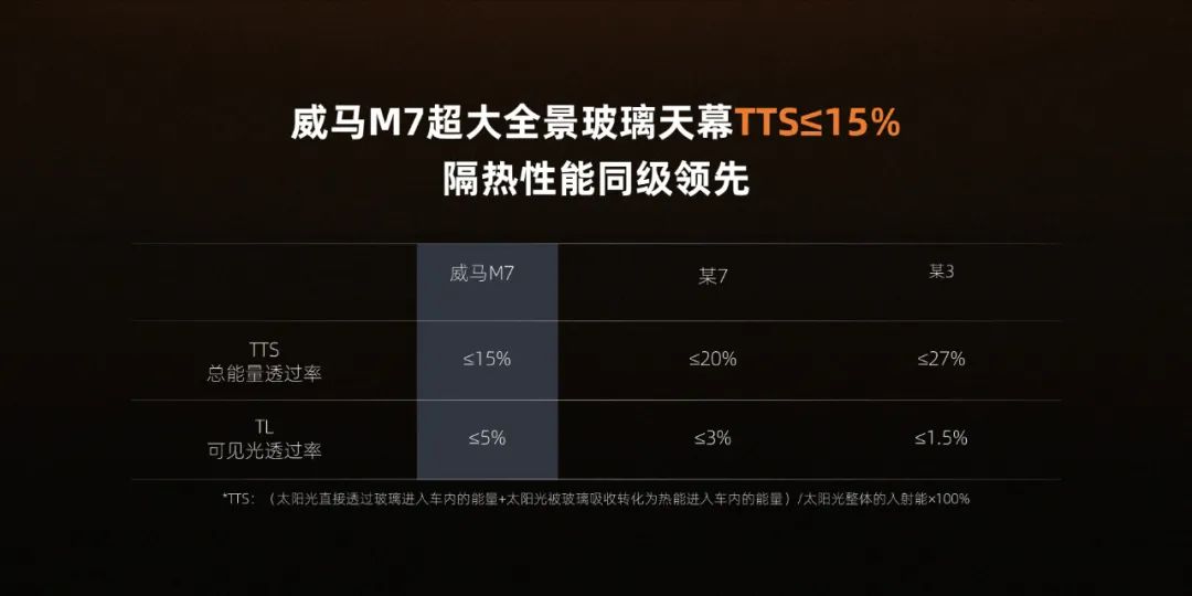 在热浪和烈日之下,很多座舱秒变“桑拿房”。为了解决这一痛点,威马M7的空调系统针对极端情况做了特殊优化,从60℃降至26℃仅需9.5分钟。为了阻隔热量进入,威马M7全景天幕采用了纳米镀银、PVB灰膜、Low-e镀层等三重防晒的隔热玻璃,紫外线阻隔率达到99.99%,总能量透过率(TTS)≤15%,大幅领先同级别车型,真正解决智能电动车秒变“桑拿房”的用车痛点。