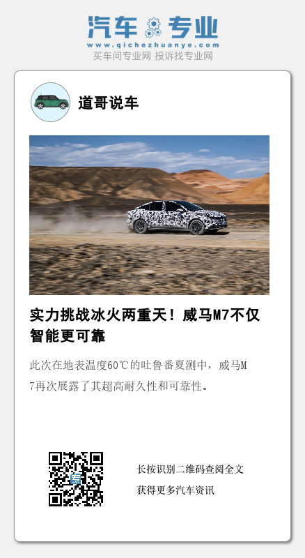 从-30℃的极寒环境到地表温度达60℃的极热环境,威马M7在续航能耗、空调以及充电方面的绝佳性能得到了严苛而全面的检验。据了解,威马M7将在今年年正式上市并开启交付。关于新车更多信息,我们将持续关注。