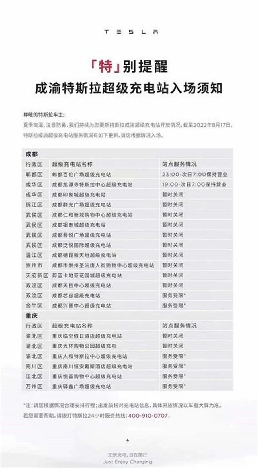 但值得一提的是,新能源汽车车主此时却有可能不算企业们让电于民的对象了。日前特斯拉官方发布公告称,截至8月17日,成都地区14个超充站中,仅有两个(郫都百伦广场和成华龙潭寺)超充站保持营业,其余都处于服务受限或暂时关闭的状态,重庆地区超充站则均为服务受限或暂时关闭。无独有偶,蔚来和小鹏也传出了类似的消息,只不过不是以官方公告的形式。