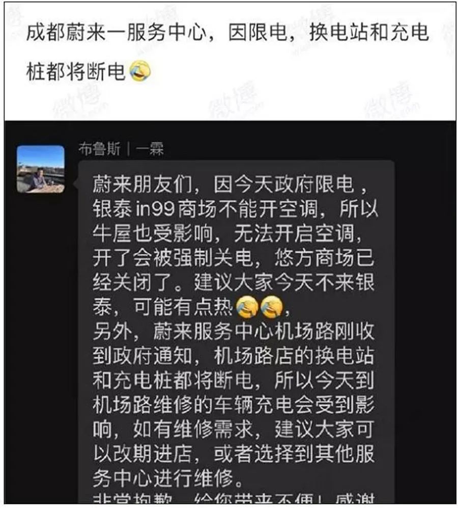 一位网名为“布鲁斯|一霖”的蔚来汽车工作人员透露,蔚来位于成都的多家蔚来服务中心断电,机场路店的换电站和充电桩也将采取断电;该工作人员还补充说,建议有维修需求的车主考虑改期进店或选择其他服务中心进行维修;另外也有网友补充说,他在近期收到来自小鹏汽车的短信提醒,短信显示,受极端高温天气影响,小鹏位于成都的多个超充站近期采取不定时营业或暂停营业以保障居民用电。