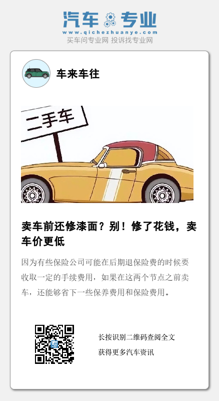 另外,在卖车的节点有讲究,除了一般所说的车市旺季、淡季之以外,如果提前就有卖车的打算可以在保险到期之前一个月左右出手,或是在车辆即将要进行大保养之前出手。因为有些保险公司可能在后期退保险费的时候要收取一定的手续费用,如果在这两个节点之前卖车,还能够省下一些保养费用和保险费用。