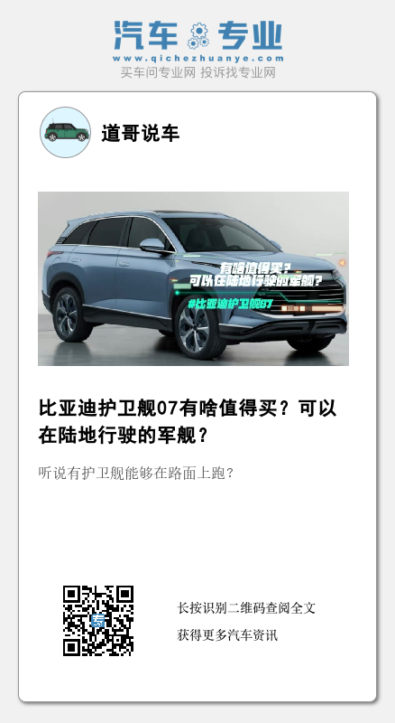 军舰是多少军舰迷的梦想,海里的我们应该是没法想了,但是听说有护卫舰能够在路面上跑,太不可思议了吧,让我们一起来看看比亚迪护卫舰07。