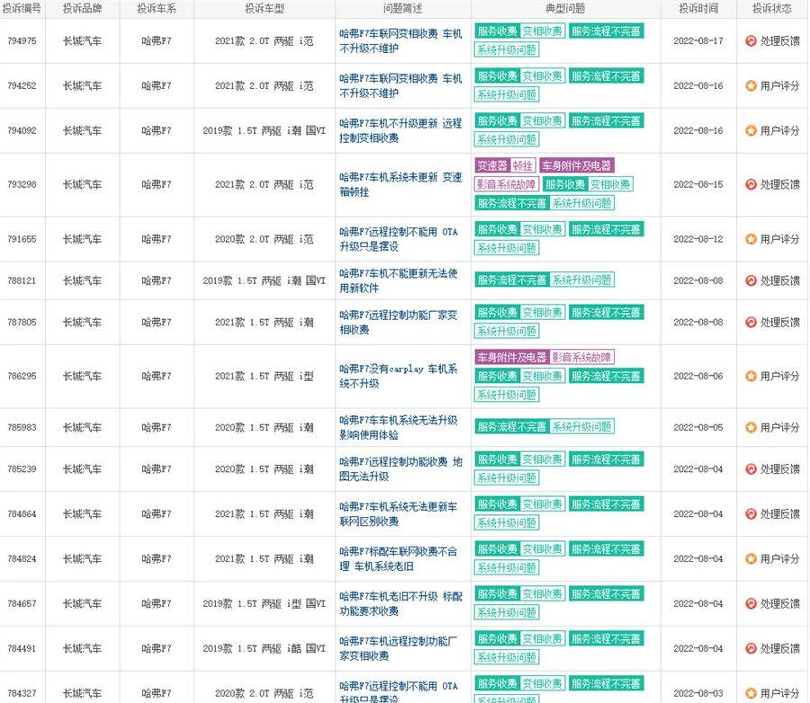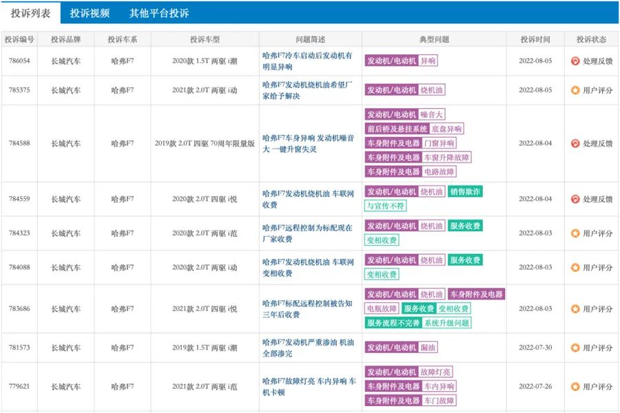 值得一提的是,除了哈弗F7、哈弗F7x在投诉平台上存在感比较强,哈弗F5、哈弗H6也遭遇了不同程度的投诉,投诉缘由与F7、F7x如出一辙。