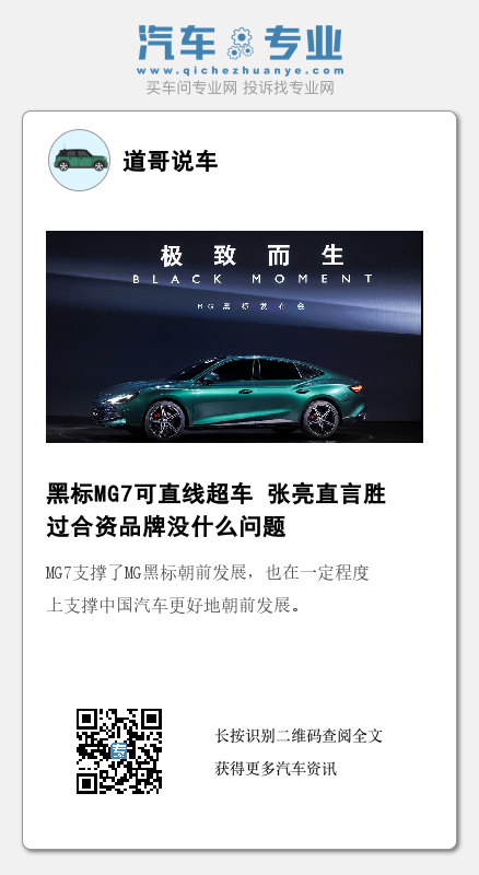 张亮在最后表达了对MG7的期望:“对于MG7,MG品牌有强烈的期望和判断,承载着品牌强烈的诉求。MG7无论是对MG,还是对中国汽车来说都有特殊意义。这是MG发起的一次对合资品牌的挑战,也是中国汽车走向更加高端的一个挑战。MG7支撑了MG黑标朝前发展,也在一定程度上支撑中国汽车更好地朝前发展。”